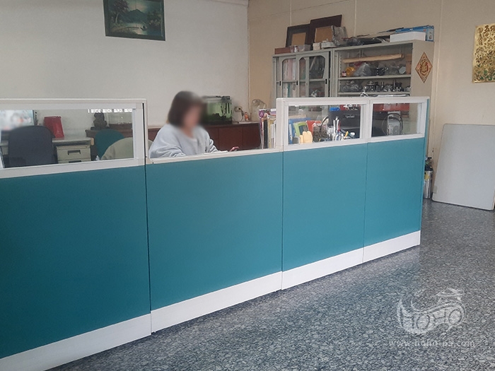 5.5公分屏風 高度:120CM 邊骨顏色:905淺灰PVC 表板配置:14底下收邊蓋-76貼布面-30清玻璃 中間以同款較低屏風做出收發櫃台空間 ※ 屏風尺寸及表板配置可依需求配置 ※ 波音皮色卡顏色多樣可選 ※ 屏風多種形態搭配,可變化不同樣貌